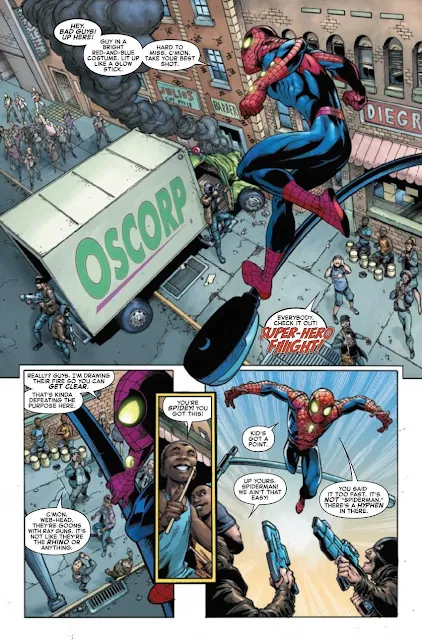 Esta é uma história em quadrinhos que é brilhantemente enganosa se o leitor não estiver ciente da enorme história que está por vir. Começa como muitos contos do Homem-Aranha; descrevendo o status quo. O Homem-Aranha está trabalhando para a Oscorp e sai para combater o crime. Isso é padrão, refrescante e sempre reconfortante. Mas então vem o elemento multiversal e cósmico do Spider-Verse que procura atrapalhar tudo. Há um breve período em que o Homem-Aranha #1 diminui a velocidade antes de irromper em uma luta frenética quando um velho vilão levanta sua cabeça.