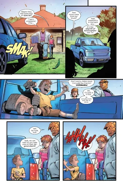 Quarteto Fantástico #1 em grande parte não tem nada a ver com o Quarteto Fantástico. Em sua essência, é uma história sobre o amor. Ao longo do caminho, North dá dicas no diálogo entre Ben e Alicia de que algo está errado com a primeira família da Marvel. Mas essas pepitas são discretas e nunca parecem que North está tentando criar um mistério. Em vez disso, as trocas parecem nada mais do que duas pessoas discutindo seus relacionamentos com amigos e familiares compartilhados.
