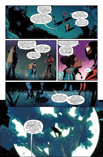 Nesse número, Miles se vê diante da deusa Bast, que representa a mitologia africana e atua como uma figura protetora de Wakanda. Desde o início, Shuri o avisa de que ele está em desvantagem ao adentrar o domínio da deusa, e que a conexão de Bast com sua terra natal faz com que qualquer invasão seja recebida com hostilidade. Essa dinâmica entre os deuses e os mortais é explorada com maestria, aumentando o drama da história.